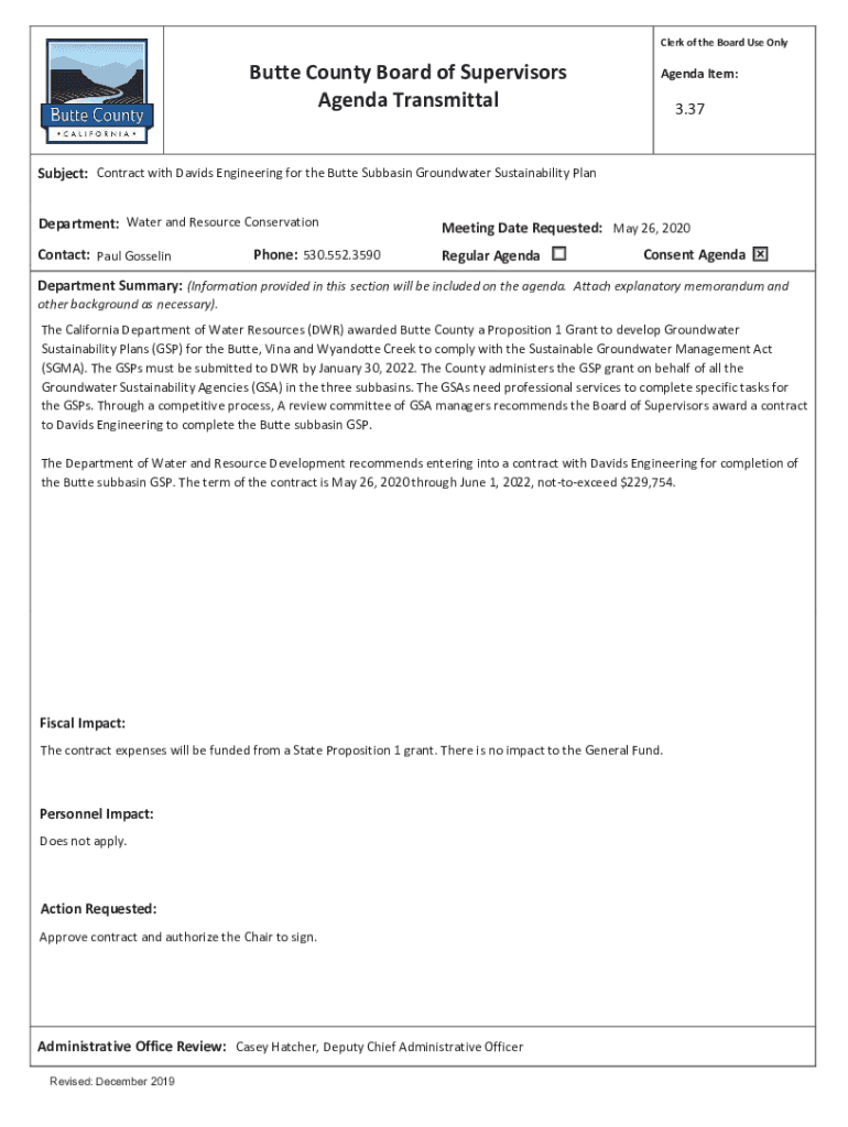 Agenda TransmittalAgenda Item:3.37Subject: Contract with Davids Engineering for the Butte Subbasin Groundwater Sustainability Plan