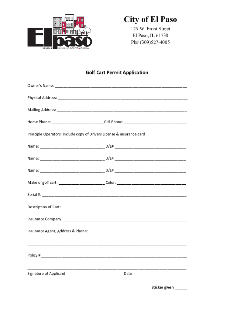 City of El Paso 125 W. Front Street El Paso, IL 61738 pH# (309)5274005Golf Cart Permit Application Owners Name: ___ Physical Address: ___ Mailing Address: ___ Home Phone: ___Cell Phone: ___ Principle