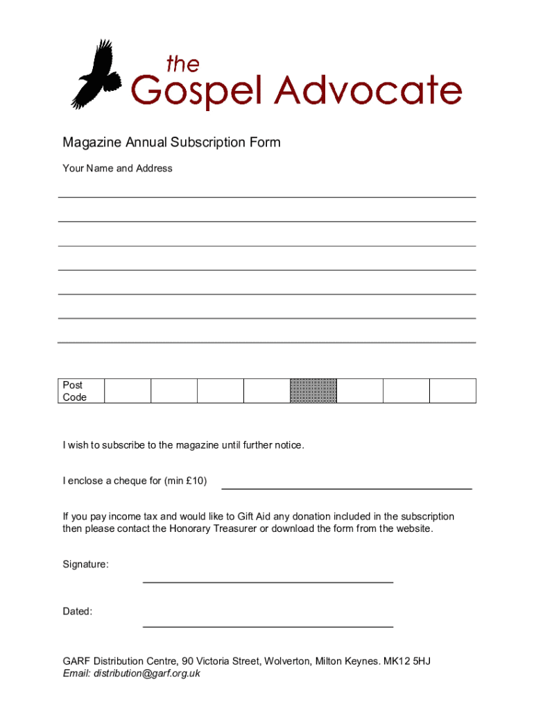 Magazine Annual Subscription Form Your Name and Address Post Code wish to subscribe to the magazine until further notice. I enclose a check for (min 10) If you pay income tax and would like to Gift