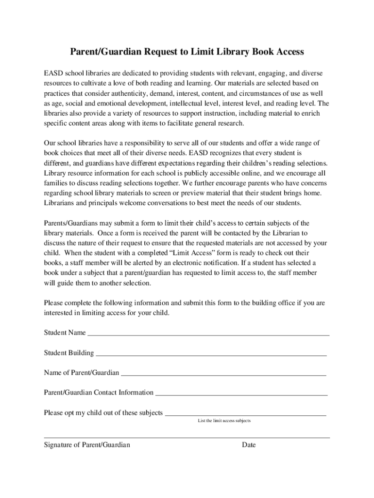 Parent/Guardian Request to Limit Library Book Access EAST school libraries are dedicated to providing students with relevant, engaging, and diverse resources to cultivate a love of both reading and