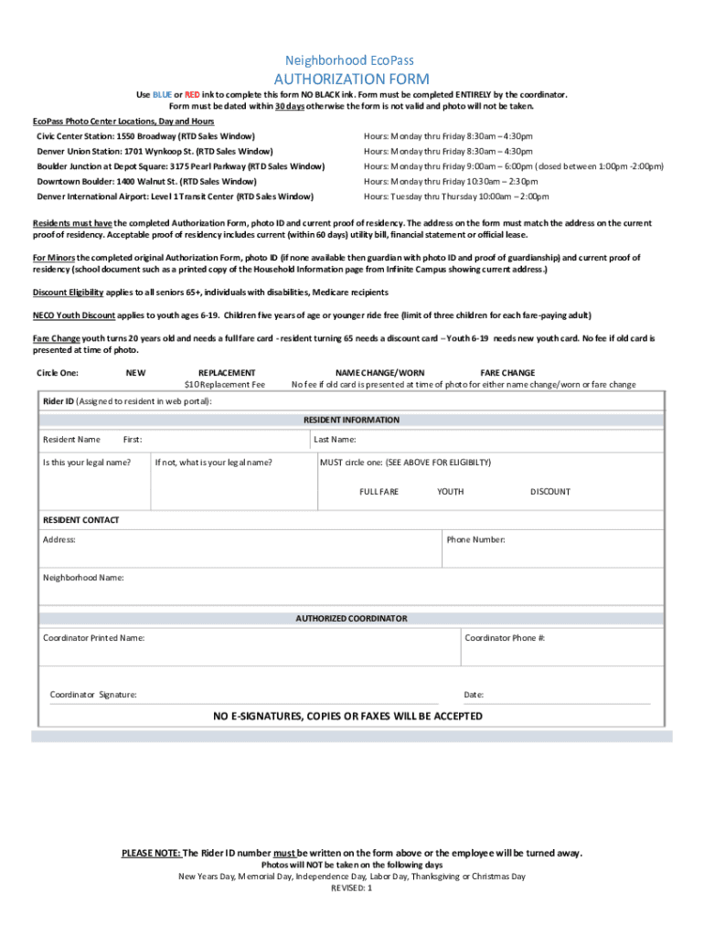 Neighborhood EcoPassAUTHORIZATION Forms BLUE or RED ink to complete this form NO BLACK ink. Form must be completed ENTIRELY by the coordinator. Form must be dated within 30 days otherwise the form