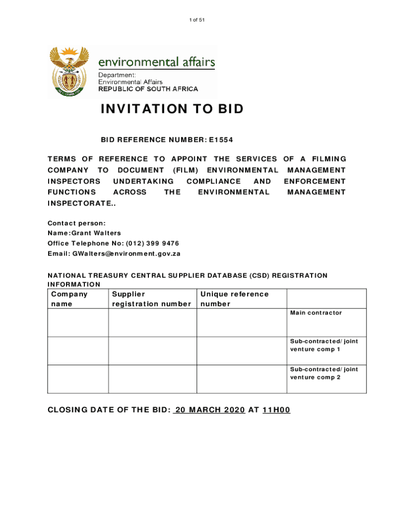 1 of 51INVITATION TO BID REFERENCE NUMBER: E1554 TERMS OF REFERENCE TO APPOINT THE SERVICES OF A FILMING COMPANYTODOCUMENT(FILM)INSPECTORSUNDERTAKINGFUNCTIONSACROSSENVIRONMENTALCOMPLIANCETHEMANAGEMENTANDENFORCEMENTENVIRONMENTALMANAGEMENTINSPECTORATE.