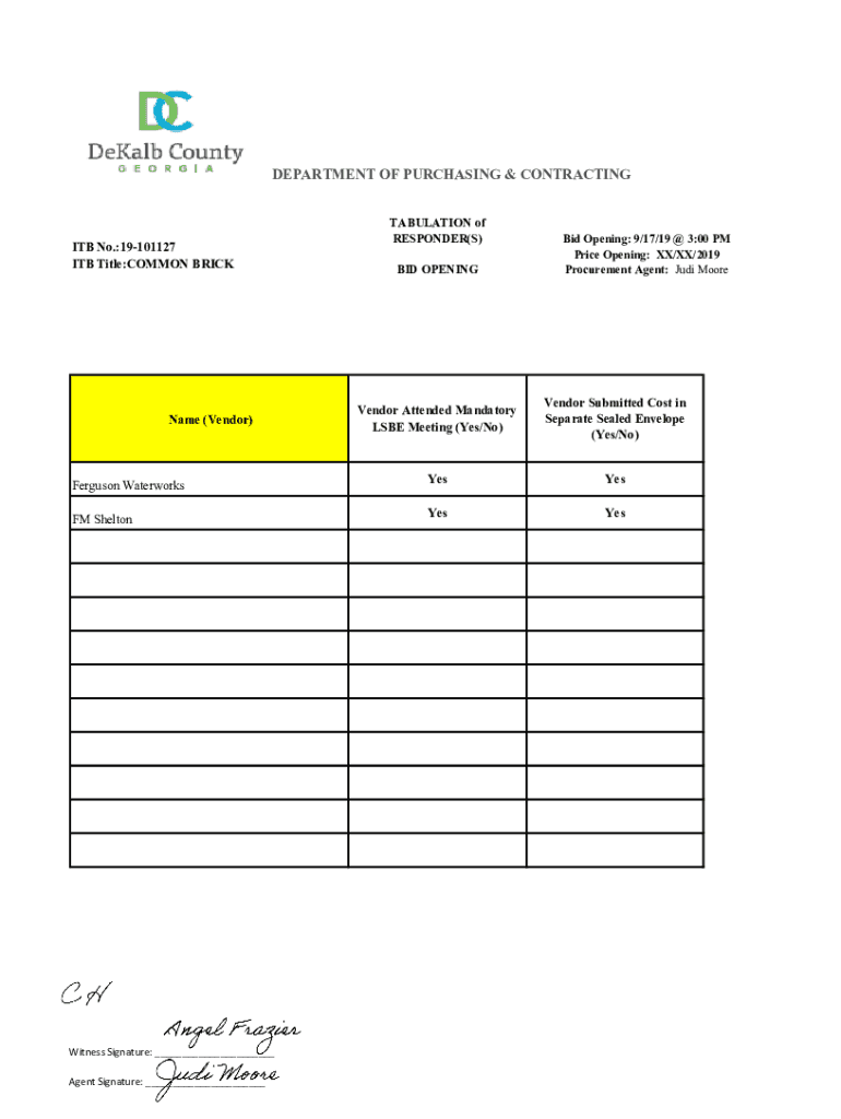 DEPARTMENT OF PURCHASING & CONTRACTING ITB No.:19101127 ITB Title:COMMON BRICKTABULATION of RESPONDER(S) BID Opening: 9/17/19 @ 3:00 PM Price Opening: XX/XX/2019 Procurement Agent: Audi MooreVendor