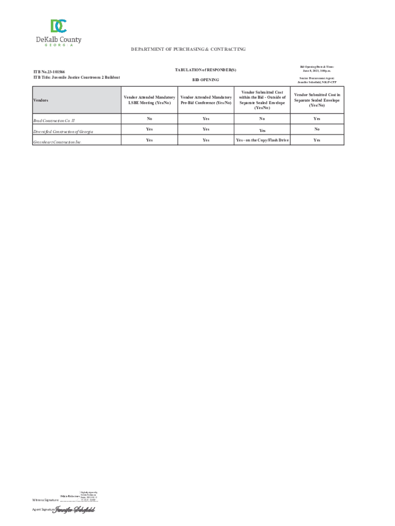 DEPARTMENT OF PURCHASING & CONTRACTING ITB No.23101566 ITB Title: Juvenile Justice Courtroom 2 BuildoutTABULATION of RESPONDER(S)Bid Opening Date & Time: June 8, 2023, 3:00p.m.BID OPENING Senior Procurement