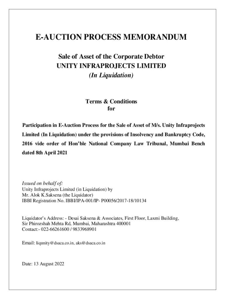AUCTION PROCESS MEMORANDUM Sale of Asset of the Corporate Debtor UNITY INFRAPROJECTS LIMITED (In Liquidation)Terms & Conditions for Participation in Auction Process for the Sale of Asset of M/s. Unity