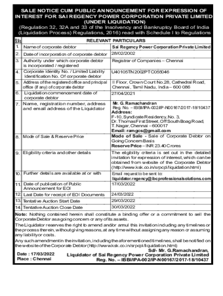 SALE NOTICE Come PUBLIC ANNOUNCEMENT FOR EXPRESSION OF INTEREST FOR SAI REGENCY POWER CORPORATION PRIVATE LIMITED (UNDER LIQUIDATION) (Regulation 32, 32A and 33 of the Insolvency and Bankruptcy Board
