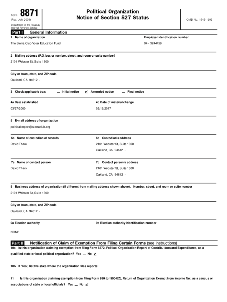 1 Name of organizationEmployer identification number Sierra Club Voter Education Fund94 32447592 Mailing address (P.O. box or number, street, and room or suite number) 2101 Webster St, Suite 1300City