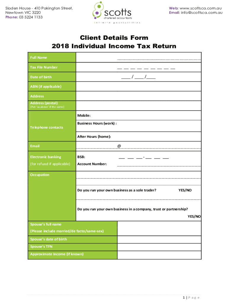 Laden House 410 Tarkington Street, Newton VIC 3220 Phone: 03 5224 1133Web: www.scottsca.com.au Email: info@scottsca.com.auClient Details Form 2018 Individual Income Tax Return Full Name__ __ __ __