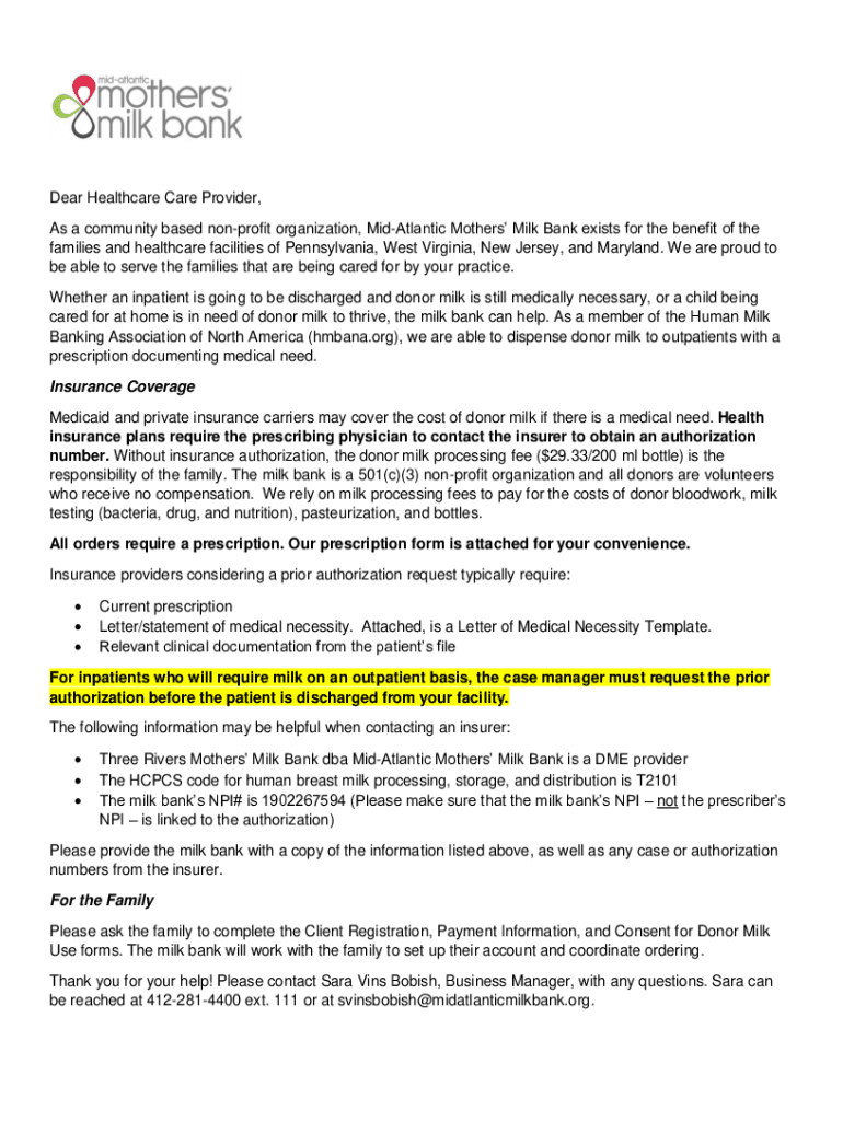 Dear Healthcare Care Provider, As a community based nonprofit organization, mid-Atlantic Mothers Milk Bank exists for the benefit of the families and healthcare facilities of Pennsylvania, West Virginia,