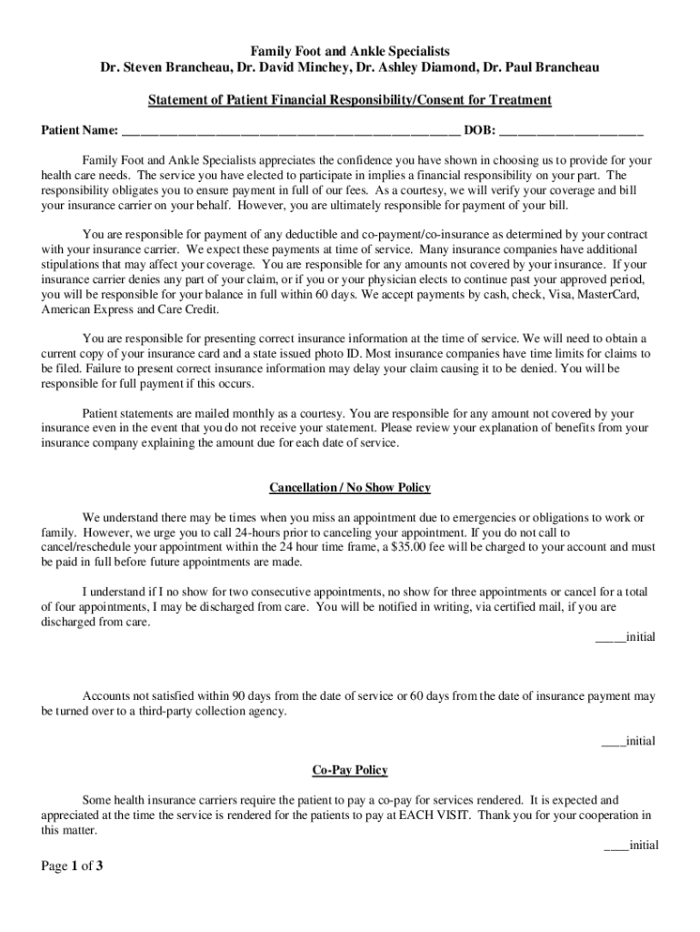 Family Foot and Ankle Specialists Dr. Steven Branches, Dr. David Inches, Dr. Ashley Diamond, Dr. Paul Branches Statement of Patient Financial Responsibility/Consent for Treatment Patient Name: ___