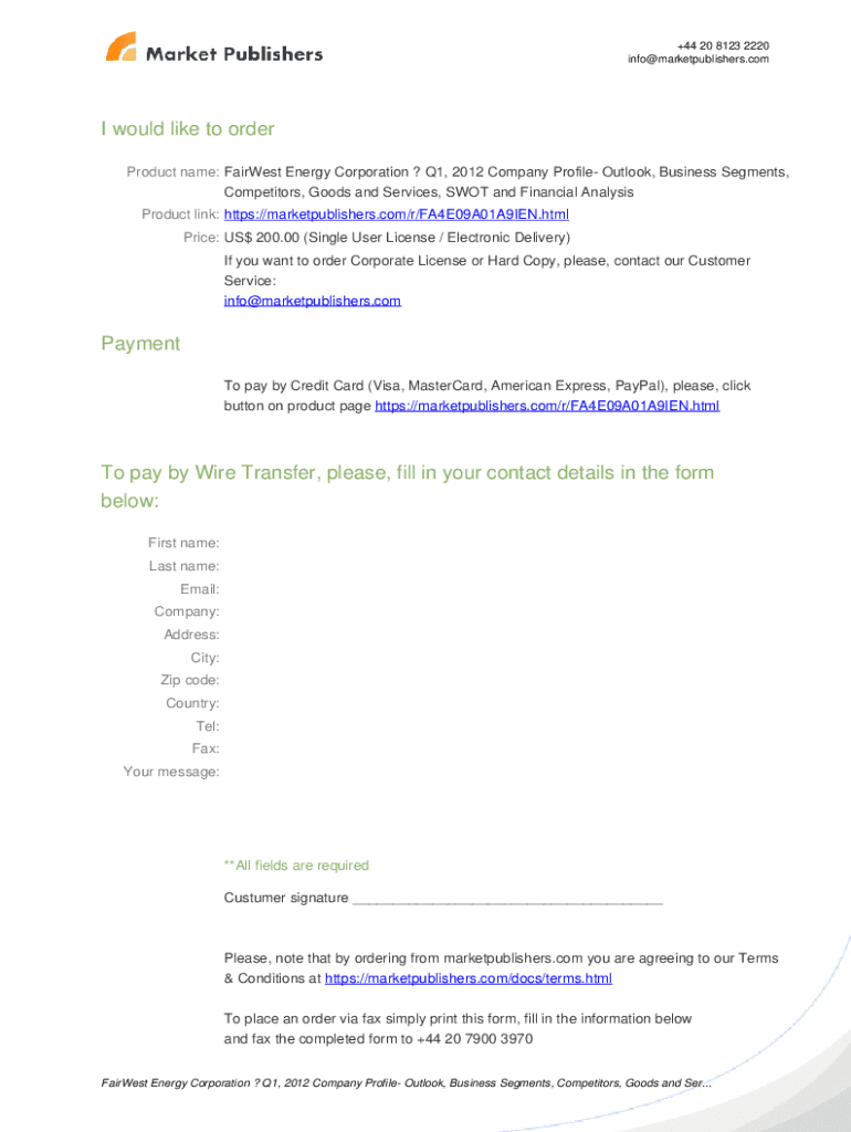 +44 20 8123 2220 info@marketpublishers.comFairWest Energy Corporation ? Q1, 2012 Company Profile Outlook, Business Segments, Competitors, Goods and Services, SWOT and Financial Analysis https://marketpublishers.com/r/FA4E09A01A9IEN.html
