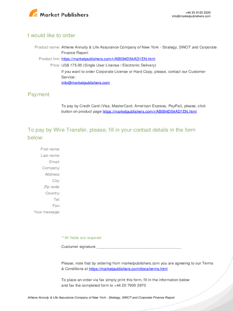 +44 20 8123 2220 info@marketpublishers.comAthene Annuity & Life Assurance Company of New York Strategy, SWOT and Corporate Finance Report https://marketpublishers.com/r/AB094D54AD1EN.html Date: July