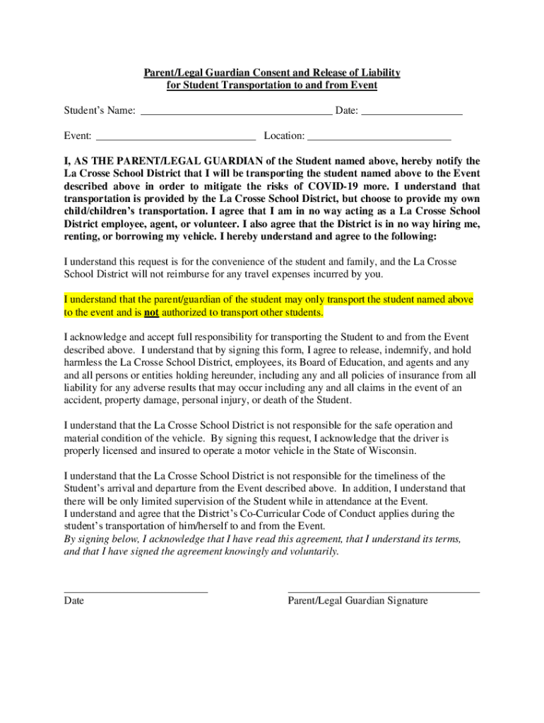 Parent/Legal Guardian Consent and Release of Liability for Student Transportation to and from Event Students Name: ___ Date: ___ Event: ___ Location: ___ I, AS THE PARENT/LEGAL GUARDIAN of the Student