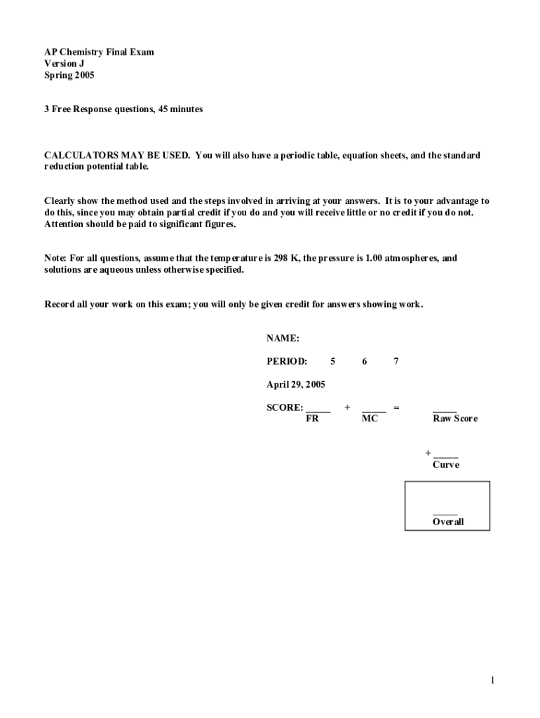 AP Chemistry Final Exam Version J Spring 2005 3 Free Response questions, 45 minutesCALCULATORS MAY BE USED. You will also have a periodic table, equation sheets, and the standard reduction potential