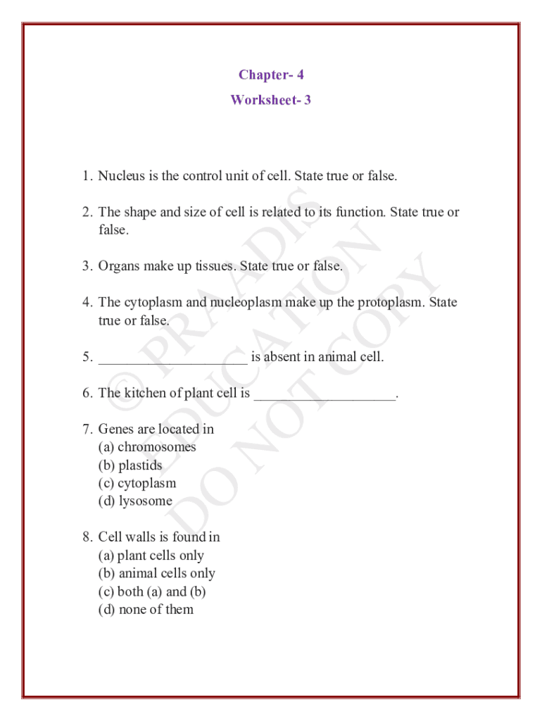 Chapter 4 Worksheet 31. Nucleus is the control unit of cell. State true or false. ED PR D O UC AA N A D O T IS T IO CO N PY2. The shape and size of cell is related to its function. State true or false.