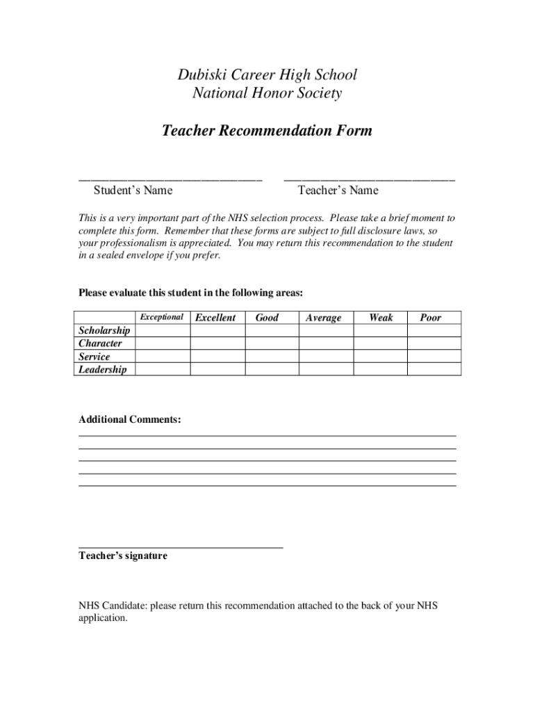 Disk Career High School National Honor Society Teacher Recommendation Form ___ Students Name___ Teachers Names is a very important part of the NHS selection process. Please take a brief moment to