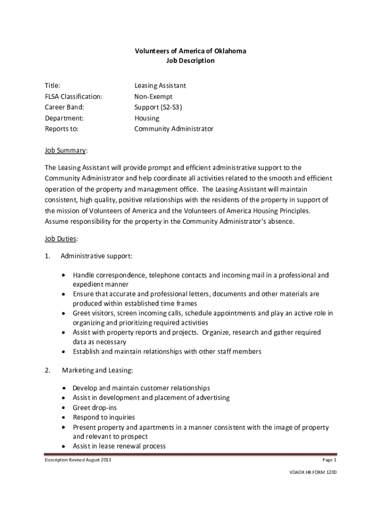Volunteers of America of Oklahoma Job Description Title: FLEA Classification: Career Band: Department: Reports to:Leasing Assistant Nonexempt Support (S2S3) Housing Community Administrator Job Summary: