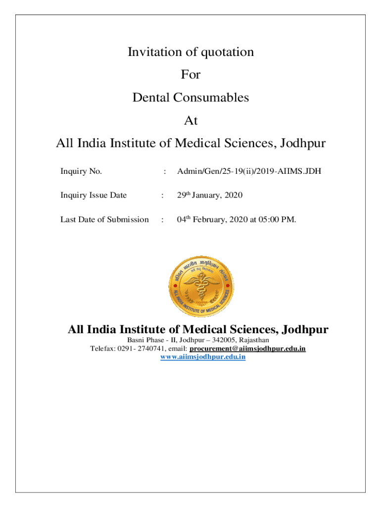 Invitation of quotation For Dental Consumables At All India Institute of Medical Sciences, Jodhpur Inquiry No.:Admin/Gen/2519(ii)/2019AIIMS. Inquiry Issue Date:29th January, 2020Last Date of Submission:04th