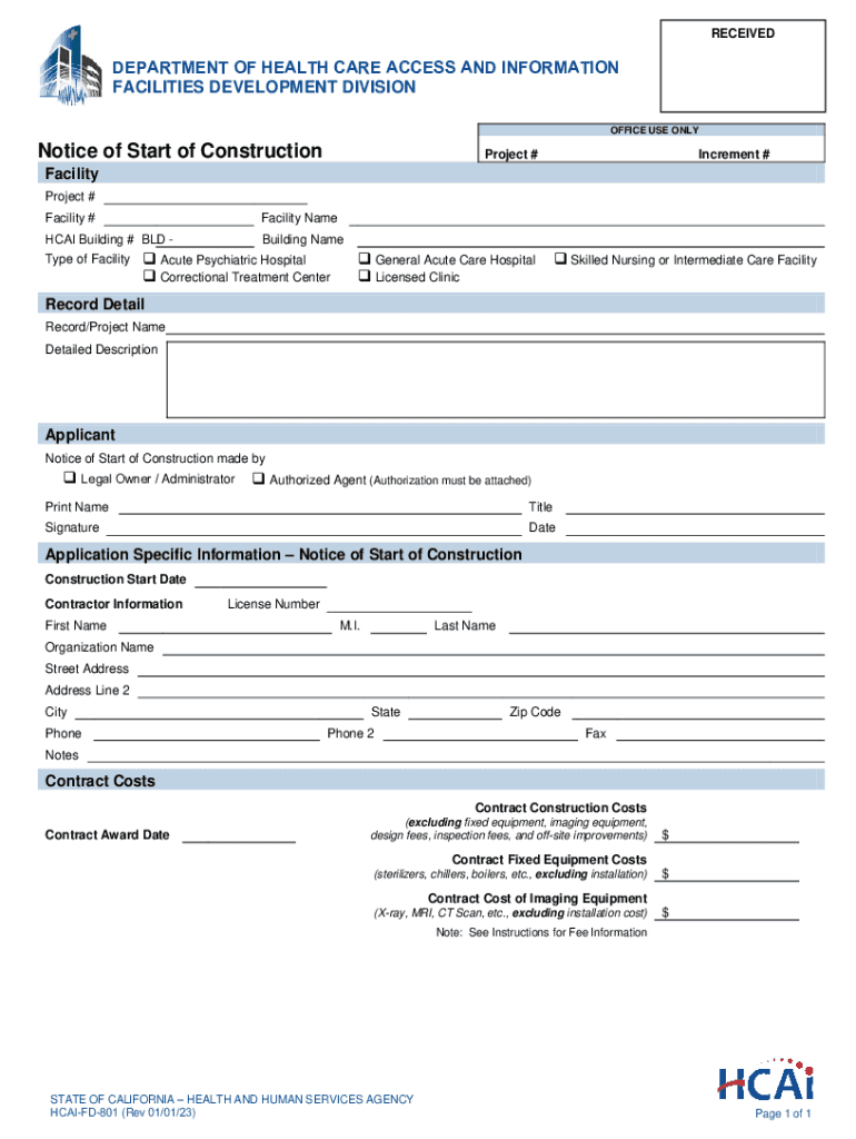 RECEIVEDDEPARTMENT OF HEALTH CARE ACCESS AND INFORMATION FACILITIES DEVELOPMENT DIVISION OFFICE USE ONLYNotice of Start of ConstructionProject #Increment #Facility Project # Facility #Facility Namecheap