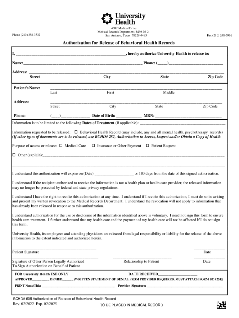 University Health 4502 Medical Drive Medical Records Department, MS# 262 San Antonio, Texas 782294493Phone (210) 3583532Fax (210) 3585936Authorization for Release of Behavioral Health Records I, ___,