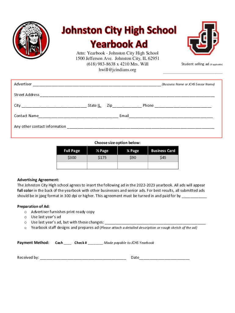 Attn: Yearbook Johnston City High School 1500 Jefferson Ave. Johnston City, IL 62951 (618) 9838638 × 4210 Mrs. Will hwill@jcindians.orgStudent selling ad (if applicable) ___Advertiser ___ (Business