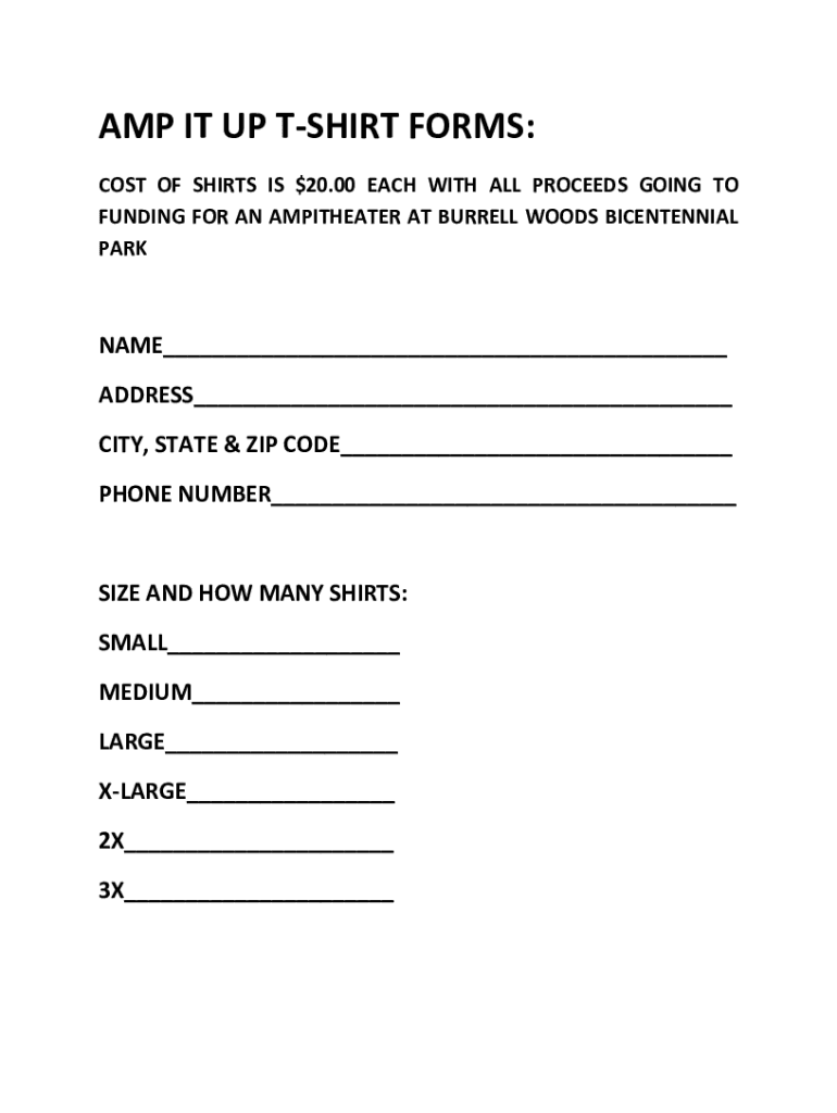 AMP IT UP SHIRT FORMS: COST OF SHIRTS IS $20.00 EACH WITH ALL PROCEEDS GOING TO FUNDING FOR AN AMPHITHEATER AT BURRELL WOODS BICENTENNIAL NICKNAME___ ADDRESS___ CITY, STATE & ZIP CODE___ PHONE NUMBER___SIZE