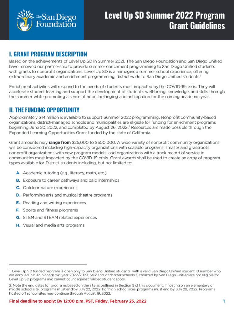 Level Up SD Summer 2022 Program Grant Guidelines I. GRANT PROGRAM DESCRIPTIONBased on the achievements of Level Up SD in Summer 2021, The San Diego Foundation and San Diego Unified have renewed our