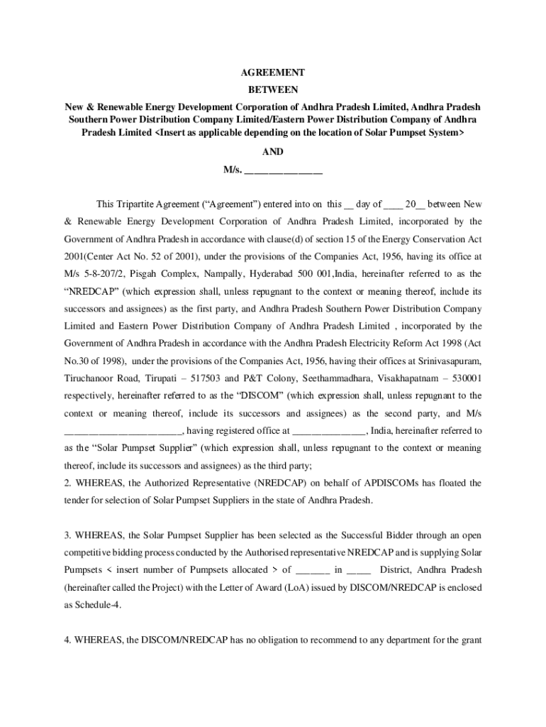 AGREEMENT BETWEEN New & Renewable Energy Development Corporation of Andhra Pradesh Limited, Andhra Pradesh Southern Power Distribution Company Limited/Eastern Power Distribution Company of Andhra