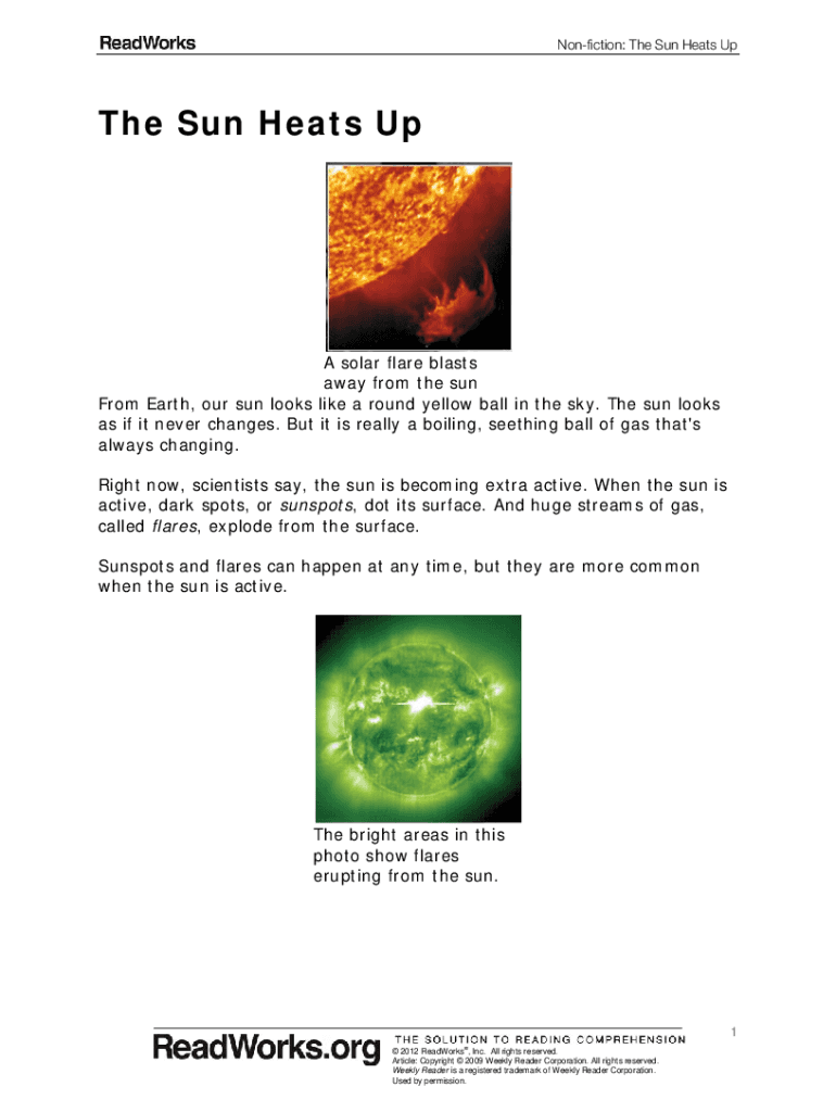 Nonfiction: The Sun Heats The Sun Heats UPA solar flare blasts away from the sun From Earth, our sun looks like a round yellow ball in the sky. The sun looks as if it never changes. But it is really