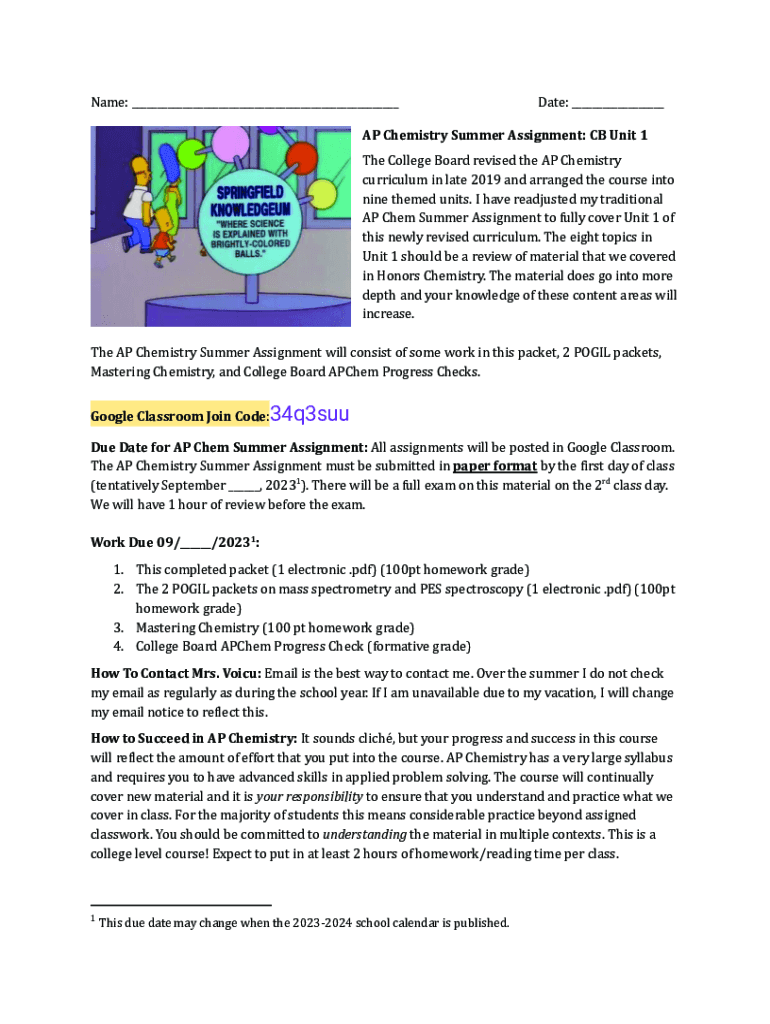 Name: ___Date: ___AP Chemistry Summer Assignment: CB Unit 1 The College Board revised the AP Chemistry curriculum in late 2019 and arranged the course into nine themed units. I have readjusted my