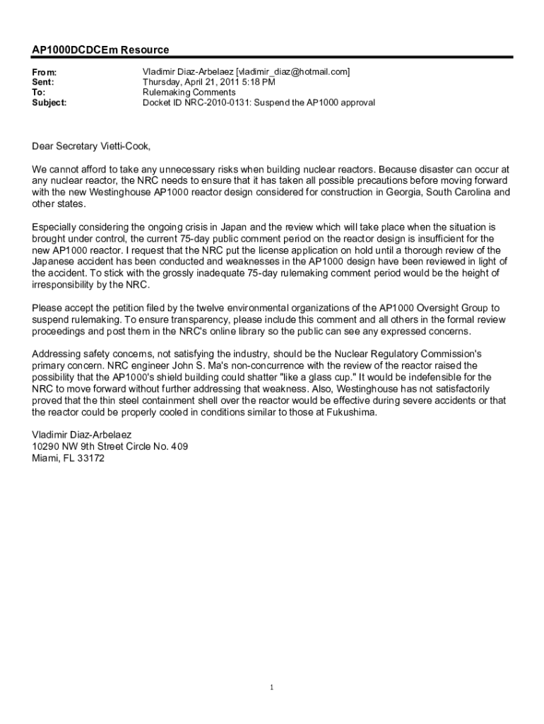Get the free Comment (4358) Form E-mail regarding the AP1000 ...