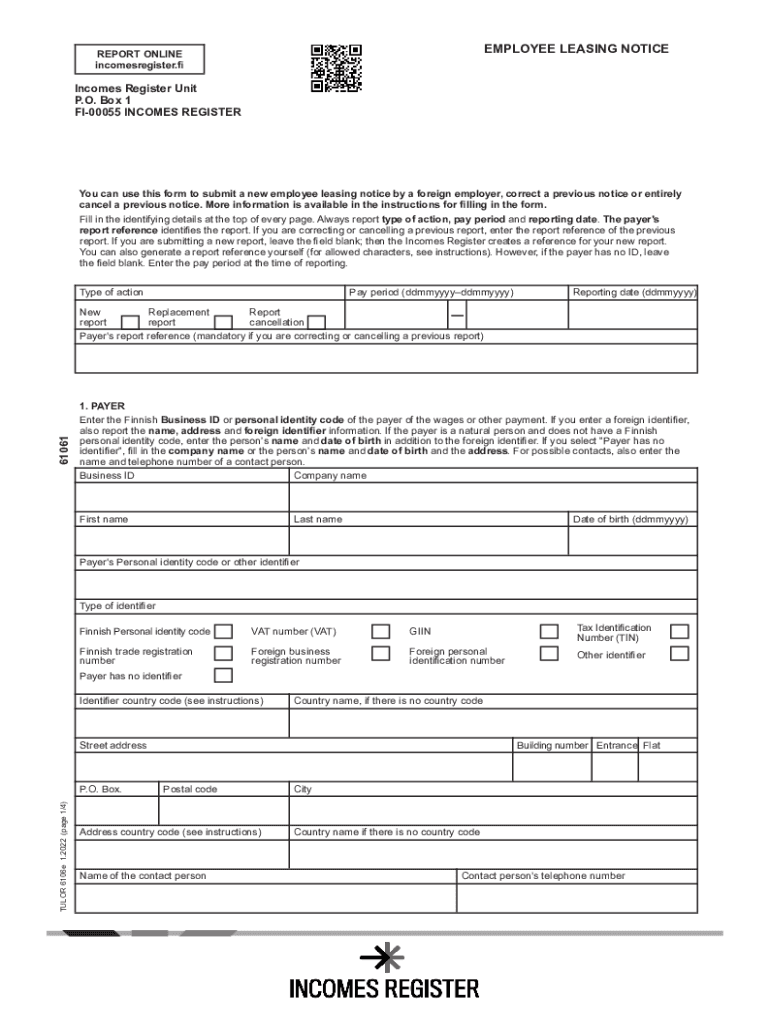 EMPLOYEE LEASING NOTICEREPORT ONLINE incomes register. Incomes Register Unit P.O. Box 1 FI00055 INCOMES Registered can use this form to submit a new employee leasing notice by a foreign employer,