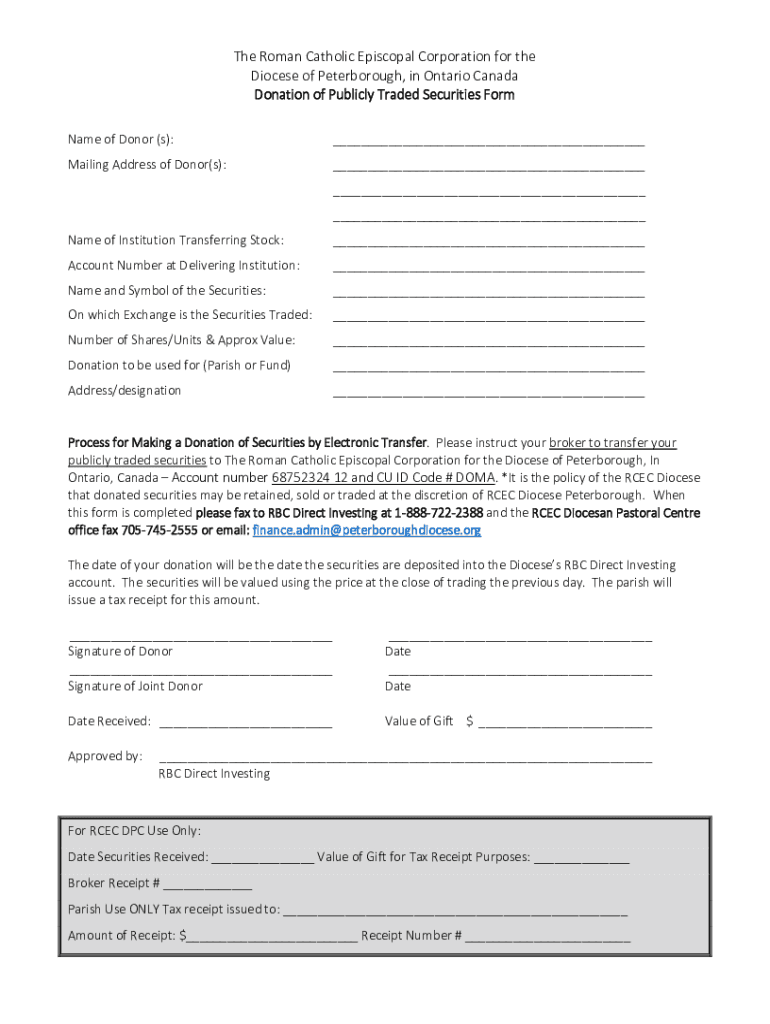 The Roman Catholic Episcopal Corporation for the Diocese of Peterborough, in Ontario Canada Donation of Publicly Traded Securities Form Name of Donor (s):___Mailing Address of Donor(s):___ ___ ___Name