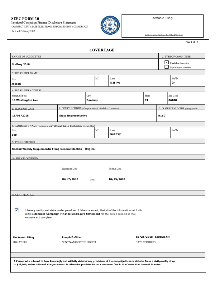 Electronic Filings EEC FORM 30Itemized Campaign Finance Disclosure Statement CONNECTICUT STATE ELECTIONS ENFORCEMENT COMMISSION Revised February 2015 Do Not Mark in This Space For Official Use Only