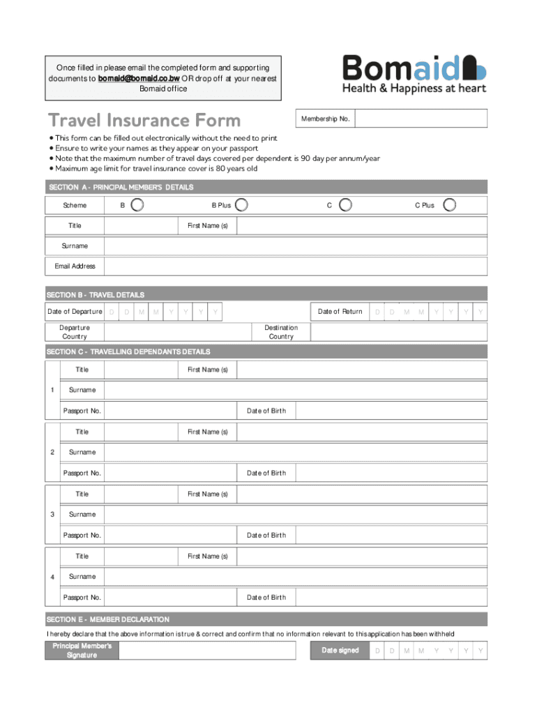 Once filled in please email the completed form and supporting documents to bomaid@bomaid.co.bw OR drop off at your nearest Bodied officeTravel Insurance FormMembership No. This form can be filled