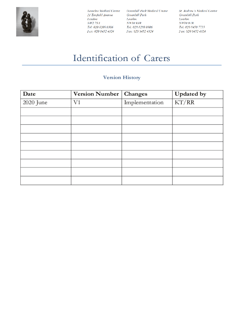 Identification of Carers Version HistoryDate 2020 Conversion Number Changes V1 ImplementationUpdated by KT/Dresden Medical Center 21 Tan field Avenue London NW2 7SA Tel: 020 8208 0306 Fax: 020 8452