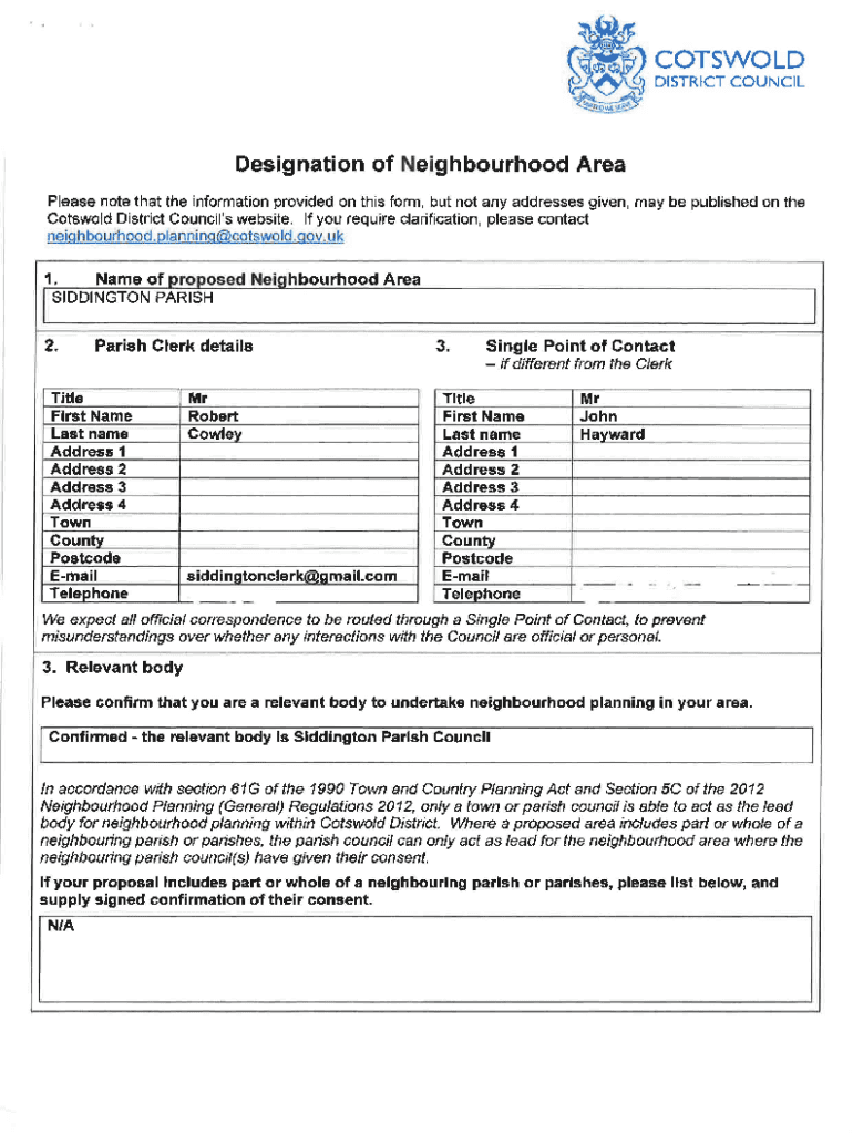 COTSWOLD DISTRICT COUNCIL Designation of Neighborhood Area Please note that the information provided on this form, but not any addresses given, may be published on the Cotswold District Council\'s
