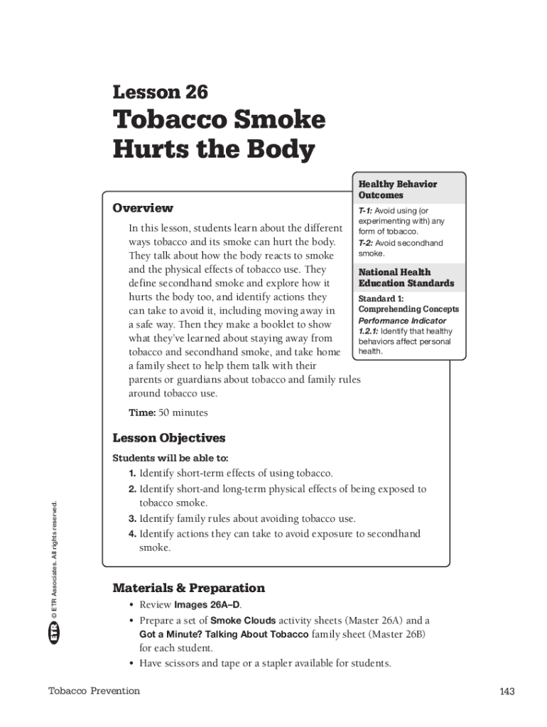 Lesson 26Tobacco Smoke Hurts the Body OverviewHealthy Behavior Outcomes T1: Avoid using (or experimenting with) any form of tobacco. T2: Avoid secondhand smoke. In this lesson, students learn about