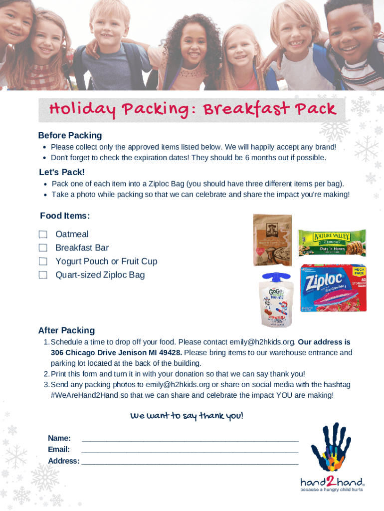Holiday Packing: Breakfast Pack Before Packing Please collect only the approved items listed below. We will happily accept any brand! Don\'t forget to check the expiration dates! They should be 6