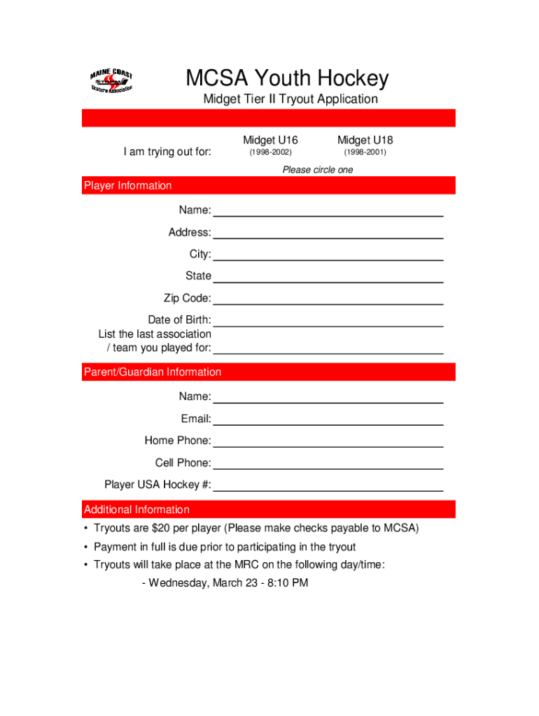 CSA Youth Hockey Midget Tier II Tryout Application am I trying out for:Midget U16Midget U18(19982002)(19982001)Please circle player Information Name: Address: City: State Zip Code: Date of Birth: