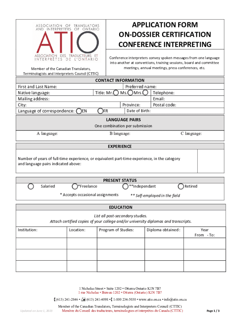 APPLICATION FORM DOSSIER CERTIFICATION CONFERENCE INTERPRETING Member of the Canadian Translators, Terminologies and Interpreters Council (ATTIC)First and Last Name: Native language: Mailing address: