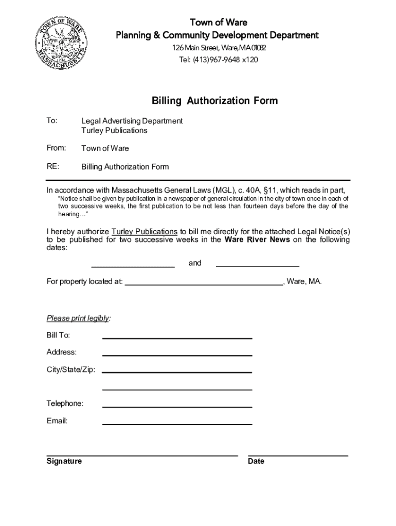 Town of Ware Planning & Community Development Department 126 Main Street, Ware, MA 01082 Tel: (413) 9679648 x120Billing Authorization Form To:Legal Advertising Department Turkey PublicationsFrom:Town