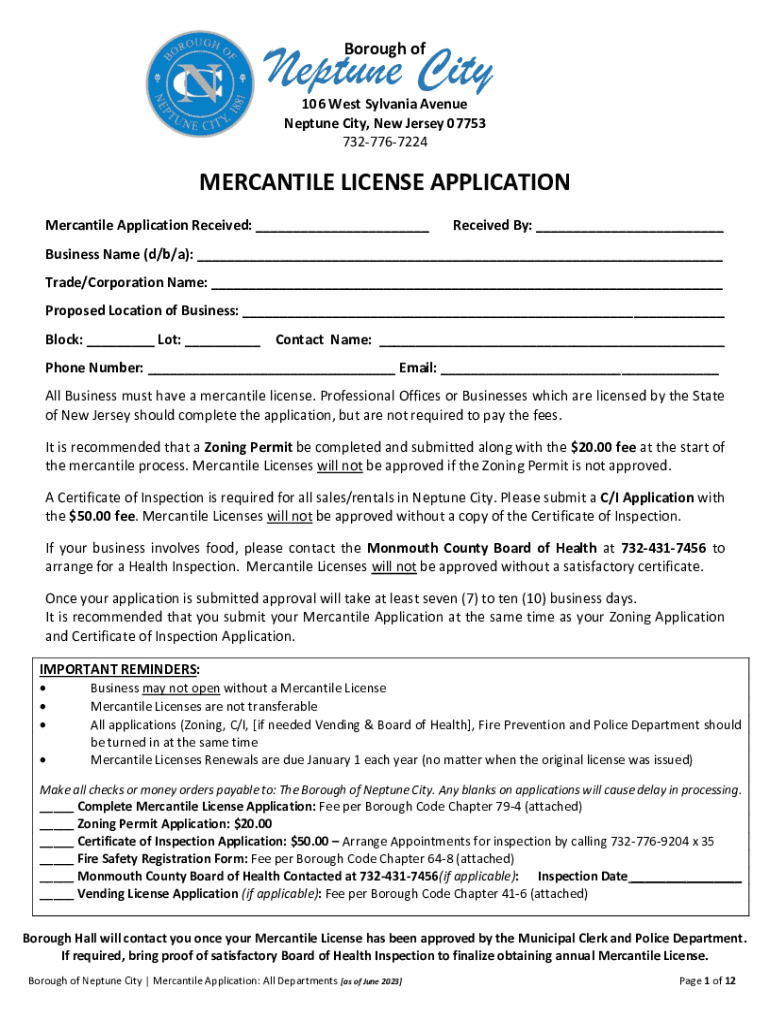 Neptune City Borough of106 West Sylvia Avenue Neptune City, New Jersey 07753 7327767224MERCANTILE LICENSE APPLICATION Mercantile Application Received: ___Received By: ___Business Name (d/b/a): ___
