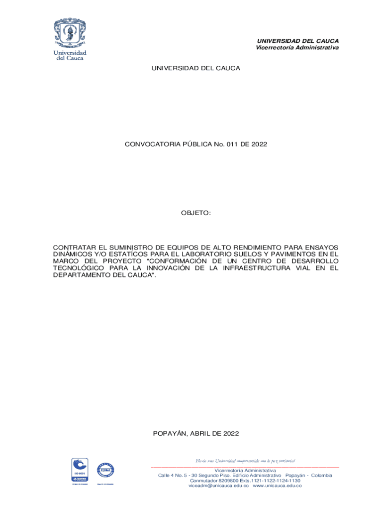 Vicerrectora AdministrativaUNIVERSIDAD DEL CAUCACONVOCATORIA PBL ICA No. 011 DE 2022OBJETO:CONTRACTOR EL MINISTRY DE EQUIPS DE ALTO RENDIMIENTO PARA ESSAYS