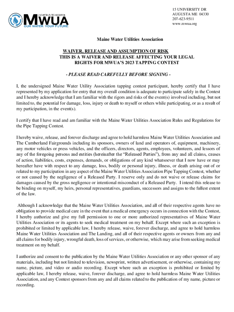 15 UNIVERSITY DR AUGUSTA ME 04330 2076239511 www.mwua.orgMaine Water Utilities Association WAIVER, RELEASE AND ASSUMPTION OF RISK THIS IS A WAIVER AND RELEASE AFFECTING YOUR LEGAL RIGHTS FOR MW UAS