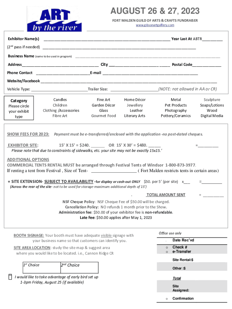 AUGUST 26 & 27, 2023 AMHERSTBURG ON, FUNDRAISER FORT MALDEN GUILD OF ARTS & CRAFTS www.gibsonartgalllery.comExhibitor Name(s)___ Year Last At ABBR___(2nd pass if needed) ___ Business Name (name to