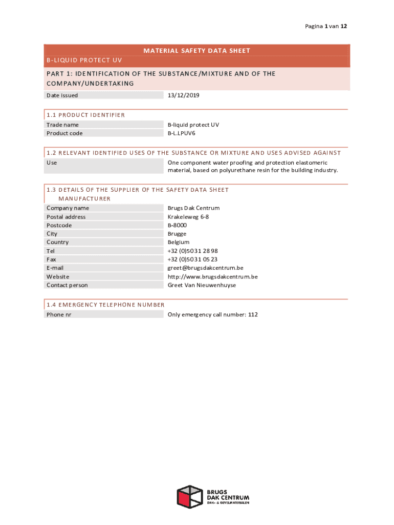 Paging 1 van 12MATERIAL SAFETY DATA SHEET LIQUID PROTECT UV PART 1: IDENTIFICATION OF THE SUBSTANCE/MIXTURE AND OF THE COMPANY/UNDERTAKING Date issued13/12/20191.1 PRODUCT IDENTIFIER Trade name Product