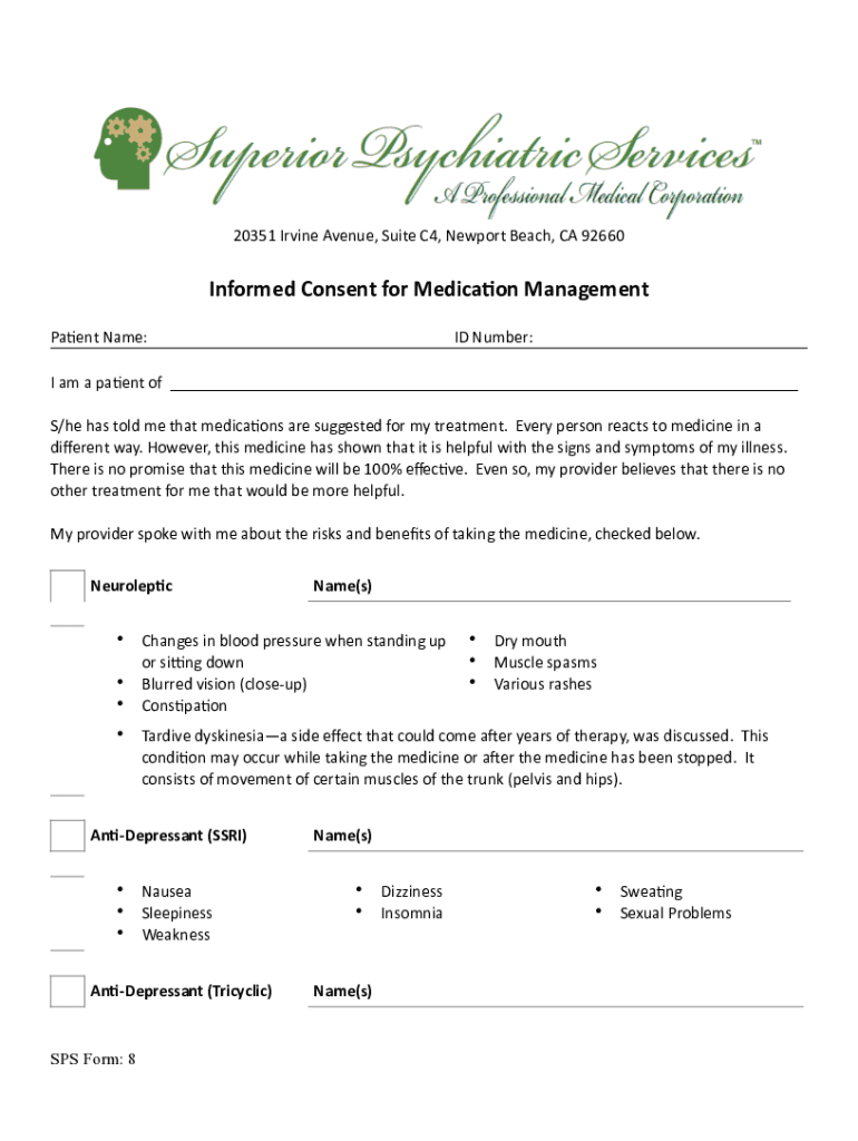 20351 Irvine Avenue, Suite C4, Newport Beach, CA 92660Informed Consent for Medica1on Management Pa?ENT Name:ID Number:I am a pa?ENT of ___ S/he has told me that media?ONS are suggested for my treatment.