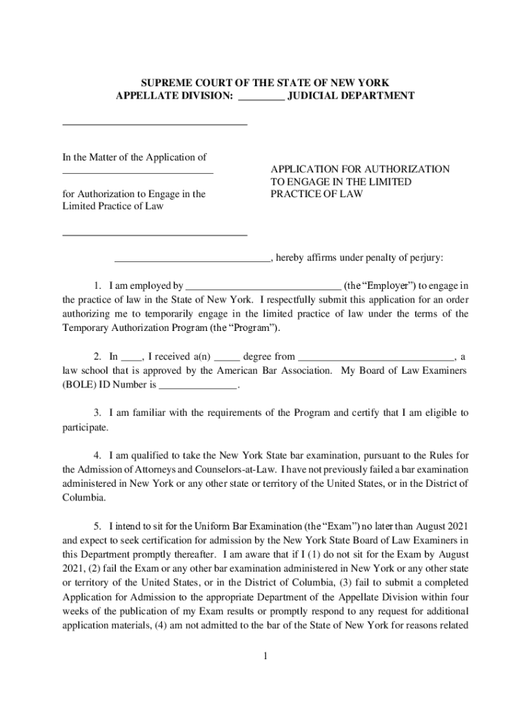 SUPREME COURT OF THE STATE OF NEW YORK APPELLATE DIVISION: ___ JUDICIAL DEPARTMENT In the Matter of the Application of ___APPLICATION FOR AUTHORIZATION TO ENGAGE IN THE LIMITED PRACTICE OF LAW for