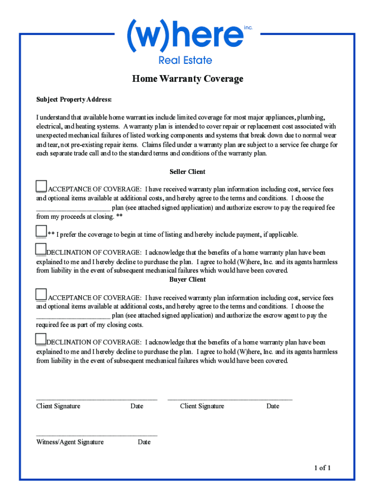 Inc.! Real Estate Home Warranty Coverage Subject Property Address: I understand that available home warranties include limited coverage for most major appliances, plumbing, electrical, and heating